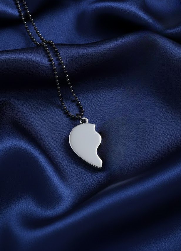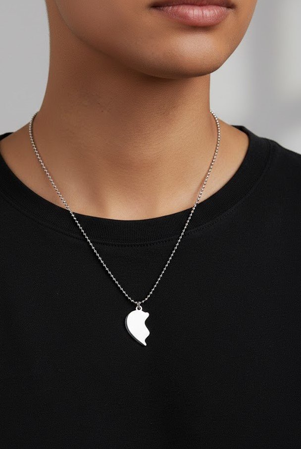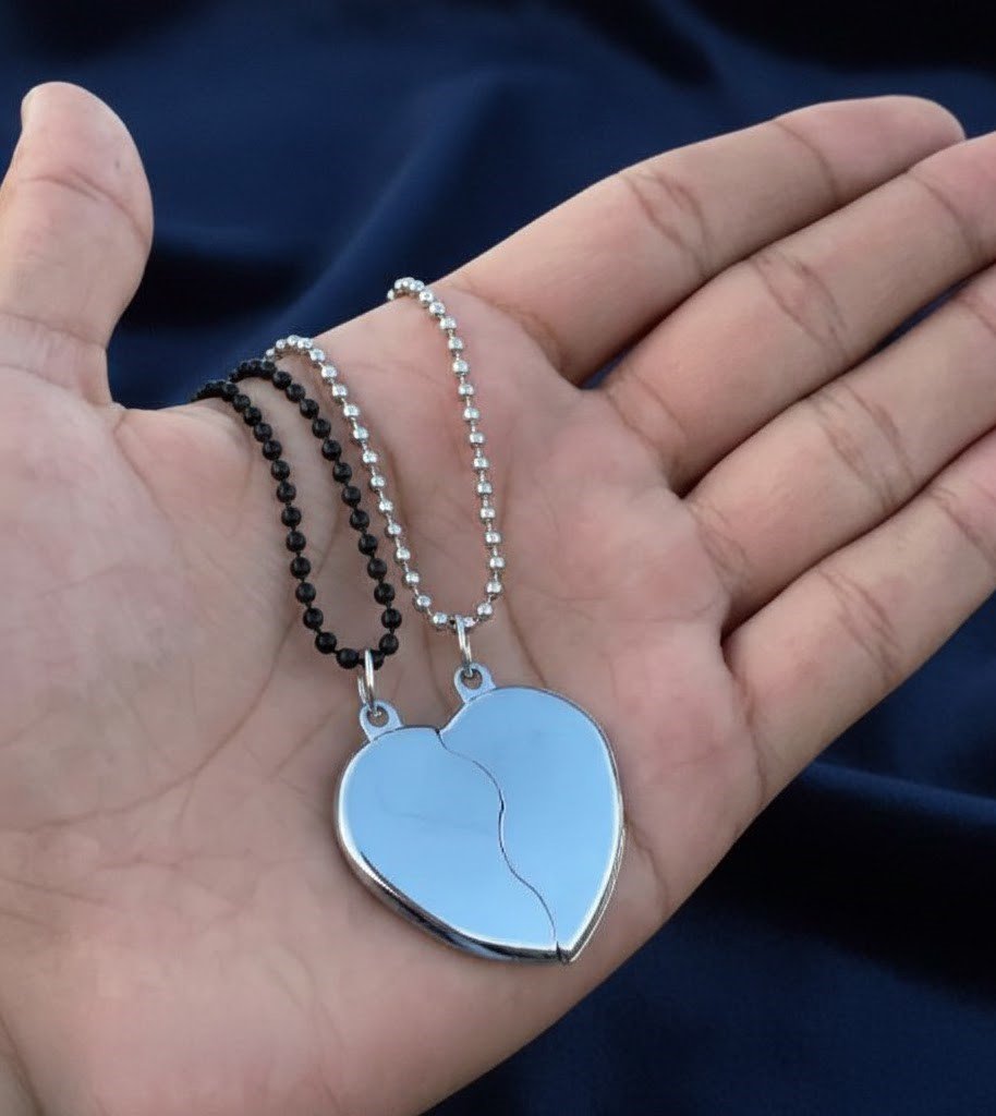 Made from premium quality stainless steel, the pendants are rust-resistant, durable, and skin-friendly for everyday wear. One pendant comes with a sleek silver chain, while the other includes a stylish black chain, making it perfect for him and her. The smooth polish and elegant finish give it a modern and attractive look suitable for daily use, dates, or special occasions.